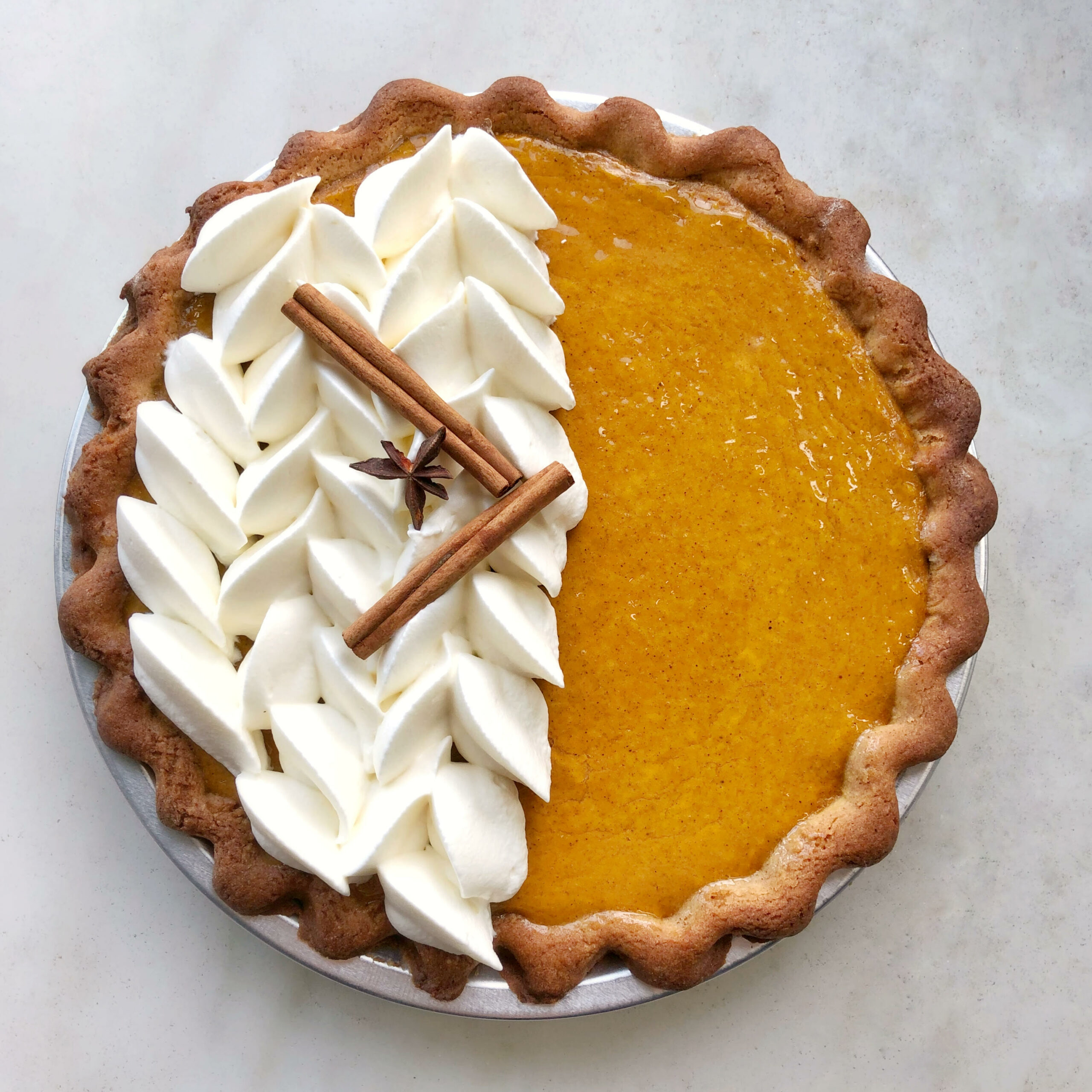 Our Extra Silky Pumpkin pie is the most elegant addition to your Thanksgiving table, triple-strained for a smooth and silky pumpkin custard, set in a hand-crimped gingerbread crust and topped with light and airy Chantilly cream to finish.