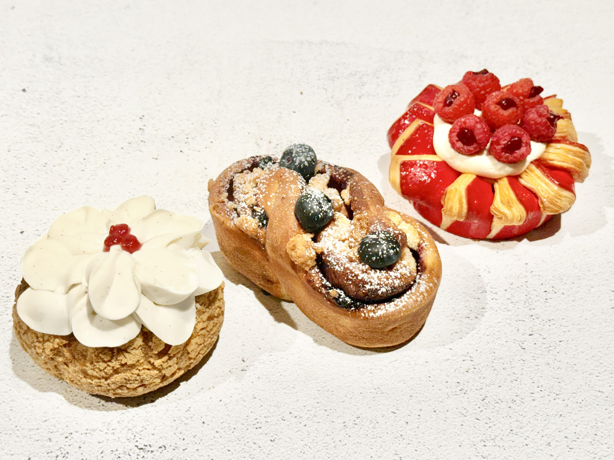 • 1 Raspberry Jasmine Danish: fresh raspberries filled with homemade raspberry jam, set atop fragrant jasmine cream and raspberry jam in a flaky laminated brioche nest